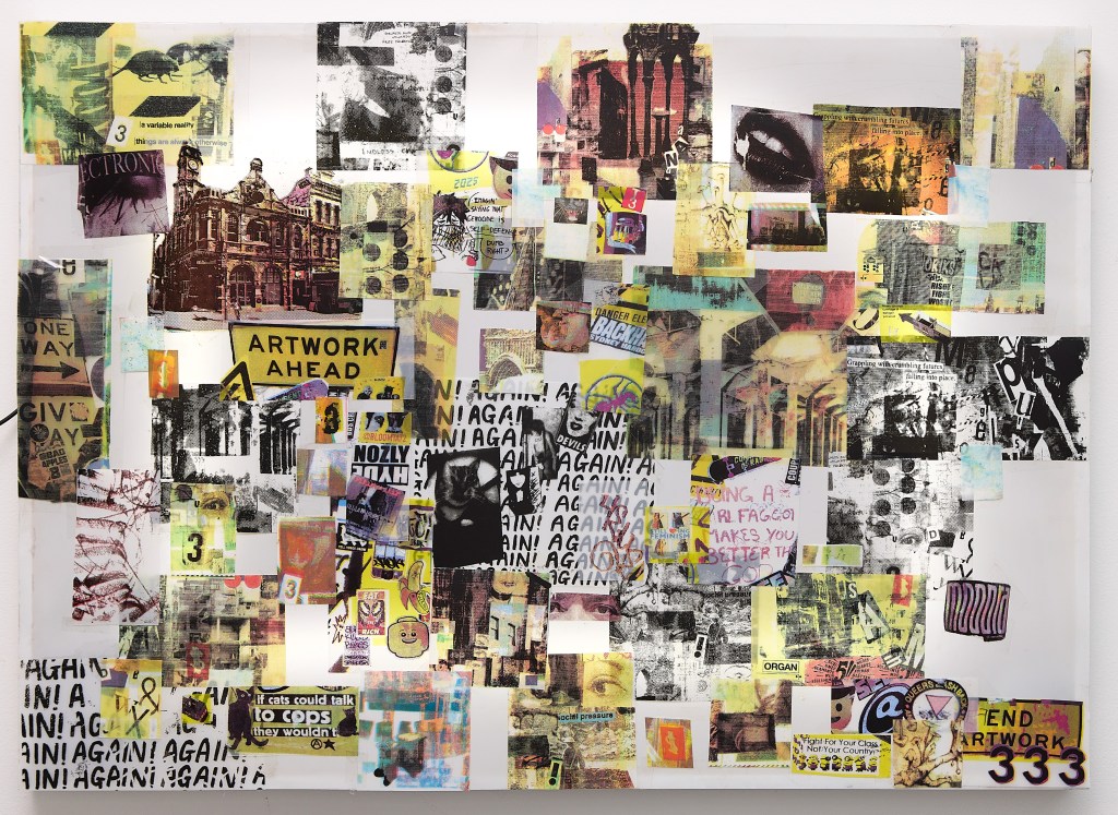 ‘BURNOUT // CRASHOUT’ collaged screenprints, lightbox, 59 x 84 cm